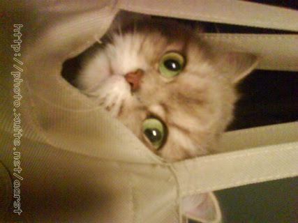 結果咩妹很自然的就去窩在袋子上面 (堅持要在工作中掺一腳)